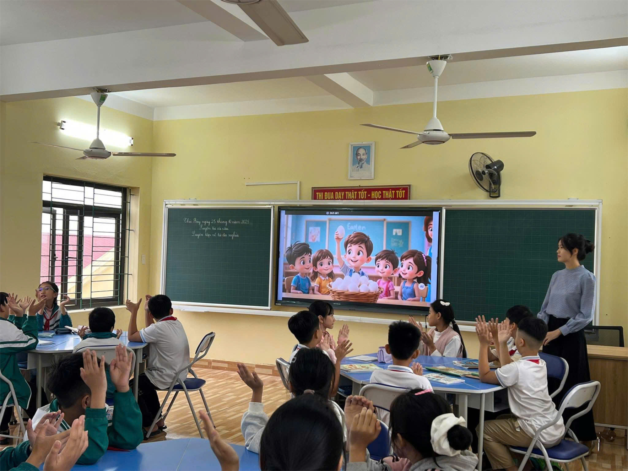 Tại chuyên đề các thầy cô được dự giờ tiết dạy minh họa môn Tiếng Việt lớp 5 – bài “ Luyện tập về từ đa nghĩa ” (SGK trang 74) do cô giáo Dương Thanh Mai thực hiện. Trong tiết học, cô giáo đã vận dụng linh hoạt các thiết bị phòng học thông minh, phần mềm hỗ trợ giảng dạy, cùng một số ứng dụng AI nhằm tạo không khí học tập sôi nổi, trực quan và hiệu quả. Qua đó, học sinh hứng thú, chủ động tham gia vào các hoạt động học tập, góp phần phát triển năng lực ngôn ngữ, tư duy và sáng tạo.